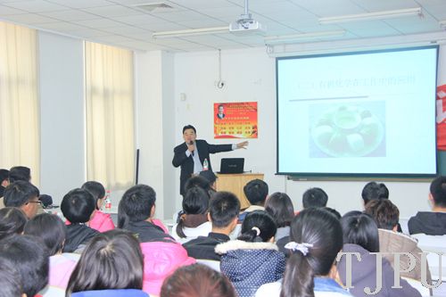 11月20日下午2时,由我校校友总会主办、环境与化学工程学院承办的2014校友讲坛第九讲在环化学院6D123举行。我校校友、天津龙莲堂生物科技有限责任公司董事长宋大龙,应邀为制药工程专业学生做了“大学专业知识在企业中的应用”的主题讲座。环化学院党委书记许世超、副院长王兵以及学院近200位师生参加了讲座。讲座由校友总会副秘书长刘栋主持。