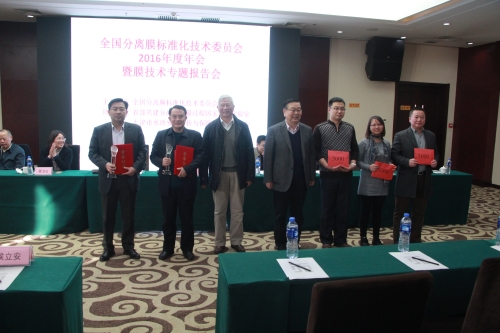 天津膜天膜科技股份有限公司、山东天维膜技术有限公司被评为“2016年度全国分离膜标准化工作先进集体”,同时哈尔滨乐普的《分离膜外壳循环压力试验方法》、津膜科技的《膜生物反应器通用技术规范》、山东蓝景的《渗透气化透水膜性能测试方法》3项推荐性国家标准以及海南立升的《柱式中空纤维膜组件》、山东天维的《扩散渗析阴膜》2项化工行业标准已获批。会上对标准编写组进行了表彰,获奖单位代表发表了获奖感言。